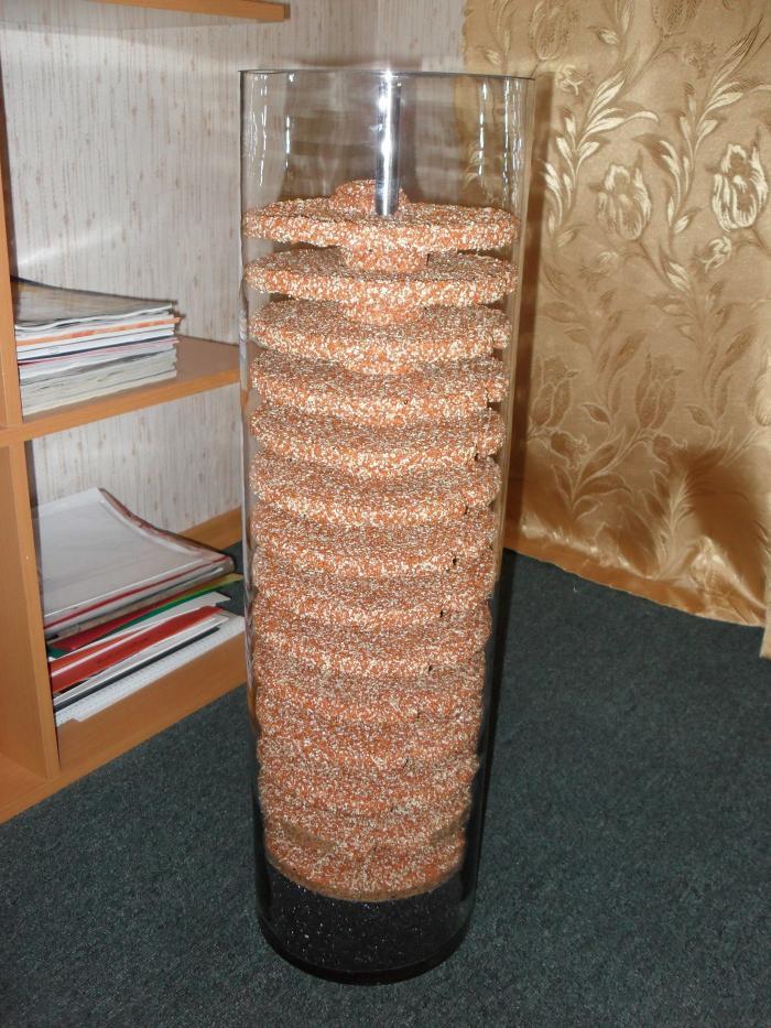 Банку взял в магазине, она по делу проходит как "ваза" и "изделия из российского стекла". Только любителям гипса не советую - стекло катаное и стенки не ровные, если вы гипс внутрь зальете то уже не вытряхните. На этой банке сверху еще будет стоят такая же по диаметру но в 4 раза ниже и в ней какое то растение или даже тупо газон. Внутреннее пространство это бутерброд из гипсовых (малых по диаметру) и пробковых (большие по диаметру) дисков.