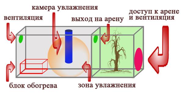 - выход на арену – отверстие диаметром 1-2 см в верхней части арены, по системе палочек, прутиков, веточек насекомые могут спускаться вниз, где планируется расположение кормушек.