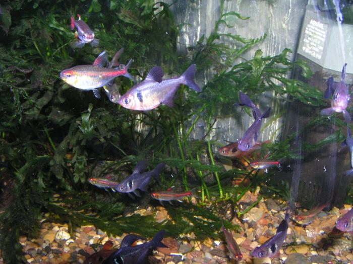 На первом фото харациновые из Южной Америки: Орнатус черный или фантом черный (Megalamphodus megalopterus) самцы и самки и грацилисы или эритрозонусы (Hemmigrammus erythrosonus)