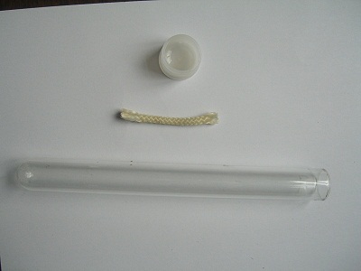 Дальше всё просто ,в пробирку набираем воду , в пробку вставляем конец шнурка таким образом чтоб он попадал в пробирку ,закрываем пробирку.