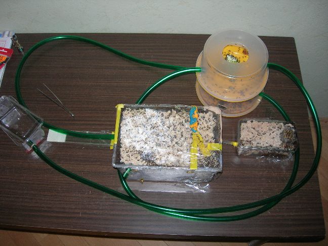 9 апреля 2011 года Андрей привёз ко мне листорезов Acromyrmex в двух контейнерах ( боксах ). Я подсоединил новую арену с открытым верхом, по краям - вазелин ( попыток перебраться через него ещё не было ) при помощи метрового шланга ( внутренний диаметр около 10 мм ). Через какое-то время я заметил, что они выносят грибницу на арену. Понял, что им тесно и добавил ещё один бокс. После этого они грибницу с арены убрали и стали заполнять новый бокс.