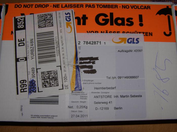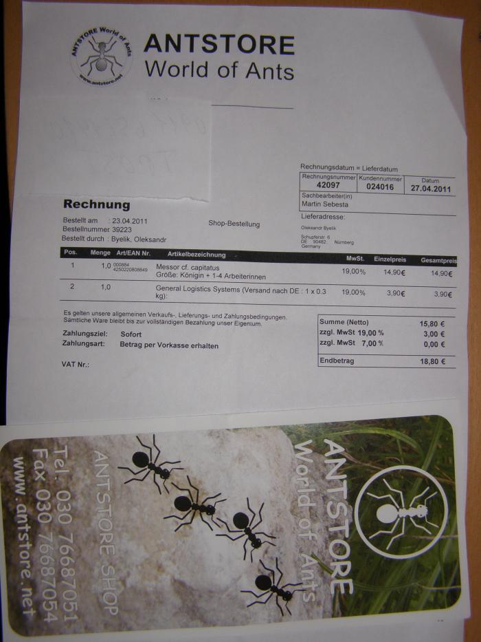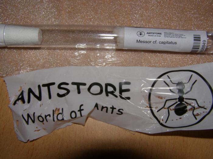 Заказал на сайте antstore.net мурашей, Messor capitatus. Отгружены, из Берлина в 18:16 27.04, а получил я их 29 в обед. Упакованы в коробочку, в пробирке. рекламационные листки, рекомендации. Пробирка завёрнута в целлофан . Всё вроде ОК! Но у меня к ним есть претензии и я им их выскажу по телефону после выходных.