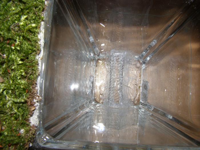 Как видно из фото, в дно вклеены две полоски стекла с сеткой . Они образуют корытце и если воды влить больше чем 5мл, то она перельётся через верх и выльется в боковые ёмкости. А уже в эти отделения входят "хвосты" гипса. Ну и он намокает.Если влаги избыток, то воду не лью. А она стоит в корытце и испаряясь (медленно ) подпитывает влажную среду.