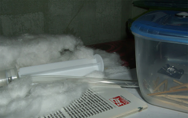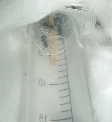 Решил попробовать осуществить подселение группы описанной в Изыскательстве. Адаптер сделал простой, для этого взял кусочек трубки, с одной стороны заткнул его ваткой, во внутрь положил комочек смоченной ваты и подсадил муравья (взял из группы одного из самых мелких). Вход "забинтовал", для этого сложил бинт 4 раза и получил небольшую сетку: и муравей не вылезет и в то же время пообщаться смогут. Этот адаптер и положил на арену где периодически нарезал круги разведчик.