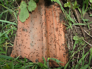 Так же метров за 15 от яблони в траве валялась черепица, перевернув которую увидели, что это был солярий мелких бурых мурашек. Черепицу тут же водрузили на место!