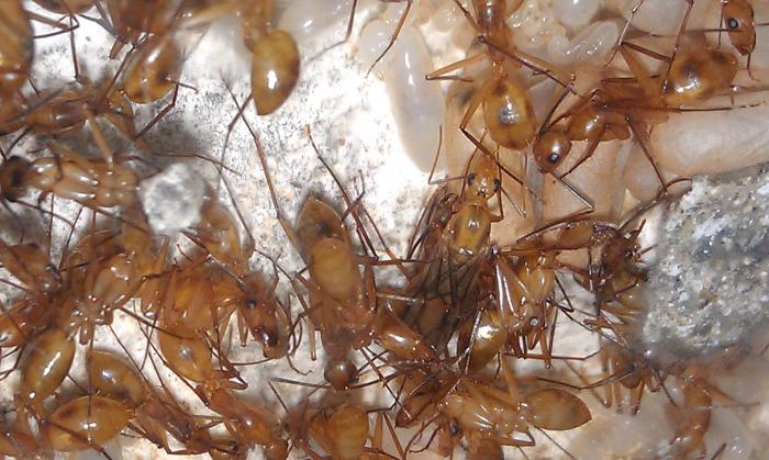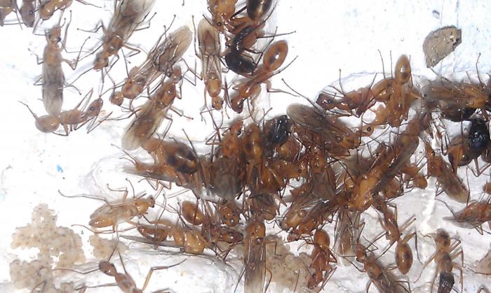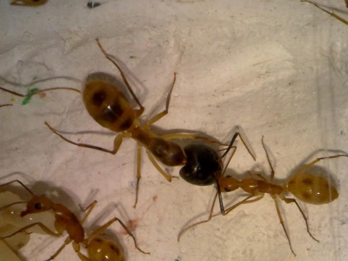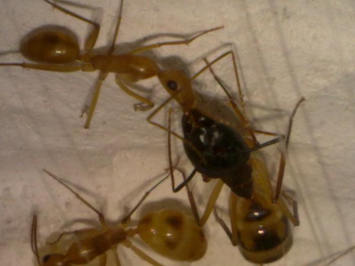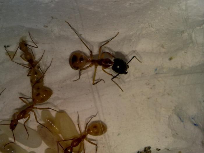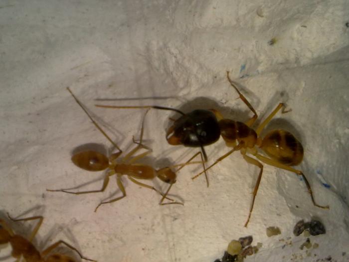 Не знаю как это назвать, поэтому назову как есть *кошмар!* Дело в том что целых 2 поколения, состоит целиком из самцов ... Тоже самое произошло и у г. Равиля ( Acim.Rof ) . Не слишком радужное будущие у этой колонии если все продолжится вот в таком вот духе ... Почему ? Дело в том что продолжительность жизни среднего рабочего не более 3 месяцев . Возможно мои опасения беспочвенны и вскоре будут появляться на свет новые рабочие, но пока из расплода только мелкие личинки, да кучки яиц . Хочу так же заметить что поведение семьи заметно изменилось . Муравьи стали малоподвижны, участились случаи суицида (это когда муравей на протяжении недели пытается вскорабкатся по стеклу, падая снова и снова ) разумеется все это происходит от того что в семью не поступают новые, молодые рабочие силы . Производство встало, что весьма и весьма печально ... колония потускнела и уменьшилась в двое . По началу от наглецов (самцов) успешно избавлялись, но теперь их стало слишком много ...