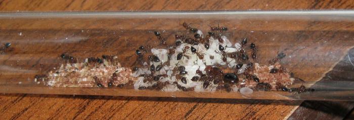 мураши благополучно держатся на стенках и потолке пробирки, также наклеены личинки и яйца на стенки пробирки кольцом.