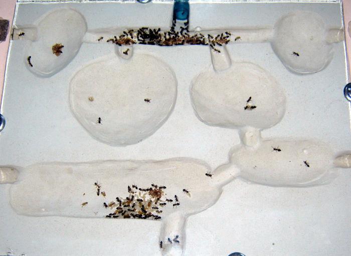 2. Вход в формикарий должен упираться в объёмную камеру, или даже лучше широкий проход примыкает с камерой совсем рядом у входа. У этих мурах есть как бы группа быстрого реагирования. Эта группа располагается непосредственно возле входа и отдыхает, а при необходимости в течении нескольких секунд выскакивает на арену с поднятыми брюшками. Когда нет места где им сидеть, они устраиваются в проходе на арену и фуражирам трудно через них пробраться. Мобилизация проходит медленнее и с большим кипешем.