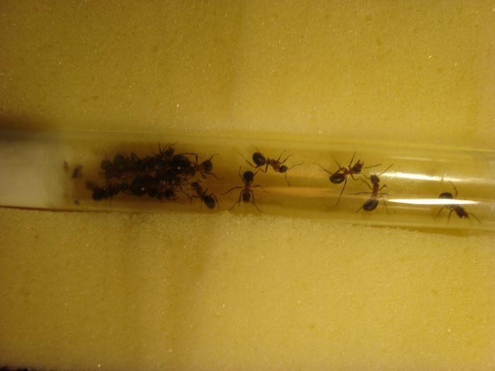 Всем доброго времени суток. Перед всеми сразу извинюсь за предыдущие вопросы и сообщения, писал по незнанке. Вот теперь кое что почитав и присмотревшись к своим муравьям понял что у меня Serviformica rufibarbis так как у рабочих муравьев имеются красные щечки и их прошлое гнездование похоже (нашел под камнем). Вчера и сегодня почитав блоги бывалых узнал что двух самок держать нежелательно но можно, что мне делать в моем случае? Самки взяты из одного небольшого муравейника под камнем. Сегодня пошел посмотреть как поживают их собратья в лесу, оказалось там еще есть самка, так что до вымирания семьи я думаю не дойдет))) Там свежие личинки очень маленькие появились. Взял еще несколько рабочих так как подумал их рассадить (своих самок). Личинок у меня уже в пробирке целая куча. Живут они все мирно. Что интересно когда принес все были в одной куче, а сегодня, в то время как пишу уже выделились 3 (так сказать) охранника, которые стоят друг за другом от входа в пробирку на разном расстоянии. Который стоит первым у входа оказался самый шустрый, к тому же у него нет половины одного усика. Вот я хочу все же задать вопрос по поводу их кормежки еще, как часто их нужно кормить? Стоит ли подсоединять арену, так как всего в пробирке 20 муравьев с 2-мя самками? Да и еще их обязательно в темноте держать? На эти вопросы конкретных ответов не нашел к сожалению, может они и есть, но не ругайте пожалуйста. Фото пытался сделать на свой 7 мпикс сони, но качество не очень, но все же выложу как интернет нормально заработает.