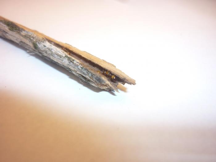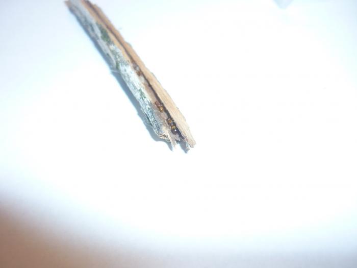 Во время поездки в Крым я нашёл колонию какого-то неизвестного вида, похожего на флавуса. колония была найдена в сухой ветке, которую я расщепил и собрал все личинки , яйца и мурах (5 штук) и посадил в шприц-инкубатор.
