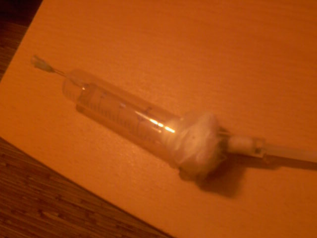 Пока нет возможности достать трубки, чтобы нормально подключить два шприца, поэтому я просто вставил один в другой и заткнул щели ваткой. В маленьком шприце ватка с водой+подключен еще один 20ти кубовый с водой, чтобы можно было подливать по мере необходимости. В большом я капаю сироп.
