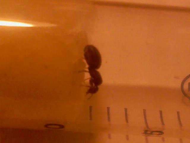 Итак, матка сидит возле капли сиропа, но не в шприце с влажной ваткой. Обнаружил два яйца, там же возле сиропа. На момент подглядывания присасывалась к нему.