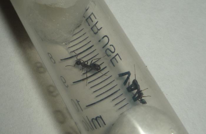 Добавил 5 "белых нигеров" (простите меня муравьишки, которые обитают под камнями) и примерно 30 коконов. Матка на них накинулась моментально, но не кусала, не била, а просто, сверху на них села, "обнюхала" и теперь они дружной семейкой сидят на влажной ватке (подгребав к себе все коконы), ждут дальнейшего развития... Надеюсь получилось у них знакомство, чтобы отметить данное дело налил им капельку сиропа))) "беленькие" с большим удовольствием "накидались"))) В полном объеме идет осмотр коконов на "пригодность". Буду наблюдать за их развитием, может даже блог заведу с красивыми фотографиями, а пока жду развития событий) Спасибо огромное Александру, без Вас бы я не справился! И конечно же всем остальным за участие)))
