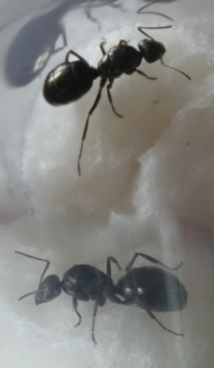 Добрый вечер. На неделе где-то 12-13 числа наловил маток у себя на работе, работаю за городом, не очень далеко лес. Была жаркая и влажная погода, выходя в курилку заметил множество маток на земле. Что бы не получилось как тем летом (поймал трёх маток и они погибли в процессе транспортировки), я поймал около 10 штук. На данный момент осталось 6. Я думал наловил Lasius Niger, потому что на территории видел множество их рабочих, но потом заметил двух маток которые чуть отличаются по цвету - они более бурые. Помогите плз, а то я полазил по сайту и совсем уже запутался %) На первой фото точно нигеры, а на второй и третьей матка чью принадлежность я не могу определить. Качество не очень хорошее, первые муравьи у меня, ещё не приловчился нормально их фотографировать:-[