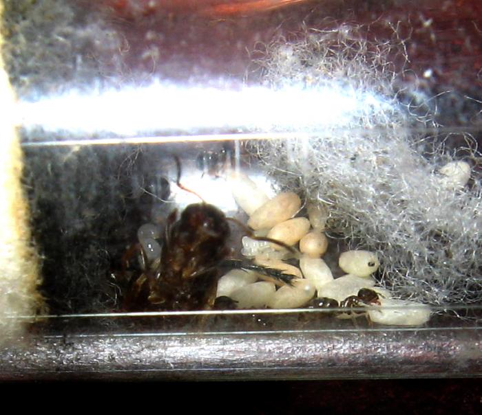 Помогите определить вид лазиуса. Матка была найдена в начале июня, т.е. задолго до начала лёта нигеров. Размерами она меньше матки нигера - около 7 мм. Рабочие тоже очень мелкие - до 2 мм.