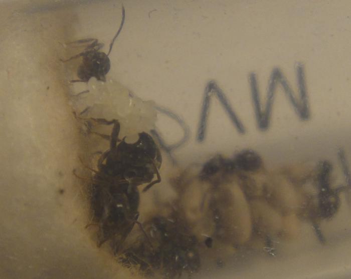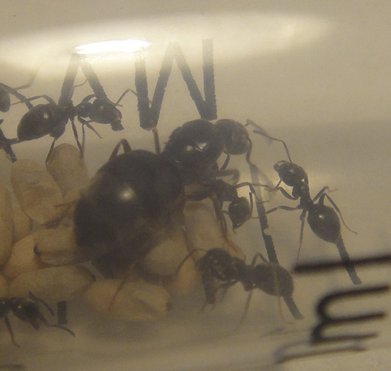Здравствуйте неделю назад поймал матку предположительно Lasius umbratus возможности набрать коконов не было и я накормил ее сиропом и положил в шкаф. Сегодня набрал коконов и собрался подсаживать к матке и заметил возле ватки небольшой пакет яиц. Я так понимаю что у Lasius umbratus без подселенных муравьев яиц быть не должно . может я ошибся с определением вида?