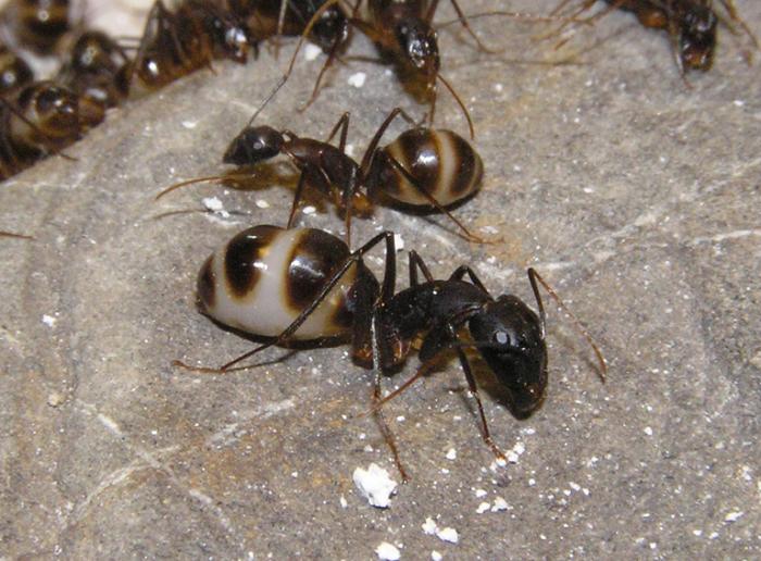 Одно время усиленно кормил их белковым кормом (мраморные тараканы). Несколько личинок быстро пошли в рост и со временем перегнали в росте даже личинок солдат. Думаю, что из них получились бы матки (т.к. гигантские солдаты были и потом, но, отнюдь, из более мелких личинок). Ни до, ни после такого огромного расплода у моих феллахов уже не было. Куда они делись? Когда-то читал, что Monomorium pharaonis травмирует маточные личинки, когда колония маленькая и лишние матки им просто будут обузой. Такие личинки прекращают свое развитие. Что из них получается, я уже не помню, но у своих кампонотусов я видел точно такую же картину: 5-7 рабочих облепляли громадную личинку и начинали ее интенсивно грызть. Грызли уверенно, но никогда и нигде не прогрызали до гемолимфы. Через два-три дня такой атаки личинка окукливалась и в итоге давала солдата.