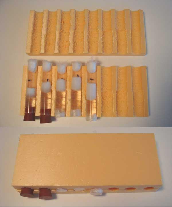 Сегодня изготовил штативчик для трубочек, в которых будут жить-поживать, да колонии наживать матки чёрных садовых муравьёв. Поскольку маткам интереснее этим заниматься в темноте, то вторая половинка штативчика заботливо закрывает их от света. Есть идея сделать такие трубочки (маточники) с гермовводами по концам. В гермовводы легко вставлять сеточки для вентиляции и трубопроводы для выхода на арену.