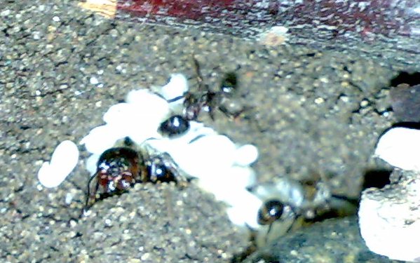 Самый главный из них - это "поймал ли я матку?" мы с братом покопались в муравейнике (только сверху, ничего не разломали)..вот, я надеялся найти муравья с крыльями, потому что был уверен, что матки обязательно с крыльями. но не нашел, достал пару коконов, пару больших муравьев, пару маленьких, и парочку огромных коконов-личинок или я не знаю, что это - белый муравьишка большой, только еще не оживленный. я надеялся, что вылупятся матки и я буду счастлив, потому что уже строю домик им. По картинкам - я уверен более чем на 90% что имею дело с messor structor. И потом увидел пару фото, где матка без крылышек. Скажите, я фото приделаю, где не оч хорошо будет видно. Есть у меня матка или нет? и когда у мессоров лет? и щас в августе вообще реально поймать кого нить или как я думал только весной лет? и что посоветуете сделать, чтобы поймать? или взять у кого нить? просто я формик сделаю завтра, и не хочу, чтобы он пустовал. да и по поводу формика у меня вопросы - но это не так важно - сначала надо выяснить, что делать с маткой? посоветуйте что нить пжлста
