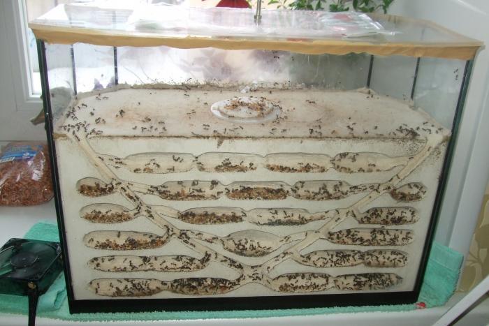 Колонии Messor structor уже 13 месяцев. Голов уже ~1200. Бурное развитие пошло с количества 150 штук - по 100 шт/мес. А потом и вовсе по 200/мес! В формикарии, с других сторон, тоже есть камеры и ходы. Внутрикамерной связи нет, только через арену. Из-за чего там нет запаха королевы и рабочие встречаясь постоянно на арене друг другу откусывают брюшки :( В день по 1-2 штуки в среднем погибает... :(
