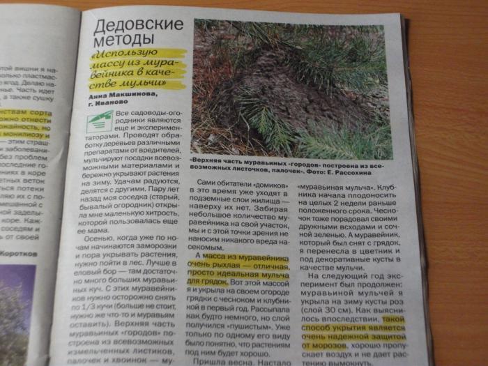 Уважаемая редакция журнала "Дом в саду"! Написать вам я решил, прочитав письмо Анны Макшиновой в сентябрьском номере журнала по использованию массы из муравейника в качестве мульчи и укрытия растений.
