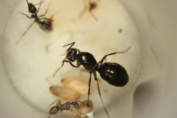 В этом году появилась возможность завести муравьёв, и я решил не упускать этот шанс. Как новичок в этом деле на поимку кого-то кроме нигеров я не рассчитывал, но мне улыбнулась удача! Совершенно случайно в одном из гаражных кооперативов нашего города я поймал матку Serviformica fusca(20.07). Первая её кладка была 5-6 яиц, но когда уже были личинки, несколько пропало, видимо она их съела. Примерно неделю назад из кокона она достала первого рабочего, сейчас их два, второму всего пара дней. Вчера их решил покормить кинул комара и мелкую мушку, и сегодня обнаружил новую кладку, в которой было 3 яйца!!! Пака решил оставить её в покое на пару недель, по мере развития колонии буду выкладывать фото и видео.