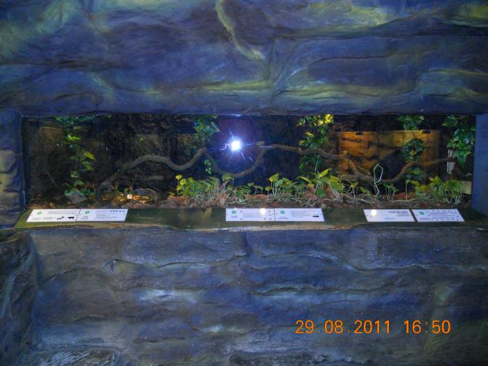 Очень интересно сделан террариум с растениями. Большой объем, красивые лианы, но муравьи могут передвигаться с листиками и без только по центральному длинному корню (за счет водных преград), что и требовалось показать. В результате оформление спасено. В московском экзотариуме даже искуственные растения (из полиэтилена и ткани) частично порезаны и разбросаны по арене.