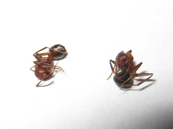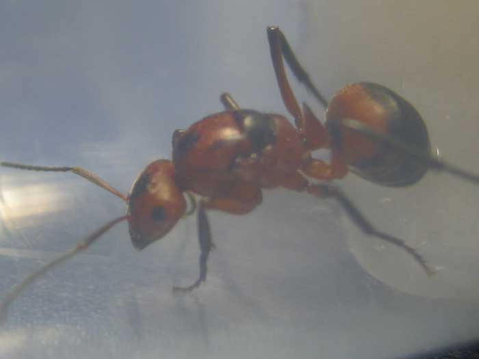 За день до поимки матки набрел на довольно крупный пень, в котором обитали формики. Понаблюдав за ними, заметил что муравьи в муравейнике слегка отличаются. У одних голова была полностью красная, а у других черная (красная только вокруг глаз). Предположил, что это могут быть F. sanguinea и их рабы. Взял несколько тех и тех для более детального изучения. Дома, заглянув в определитель, сразу понял что ошибся. Невооруженным глазом было видно, что у них нет характерной для Raptiformica выемки на наличнике. И я потерял к ним интерес.