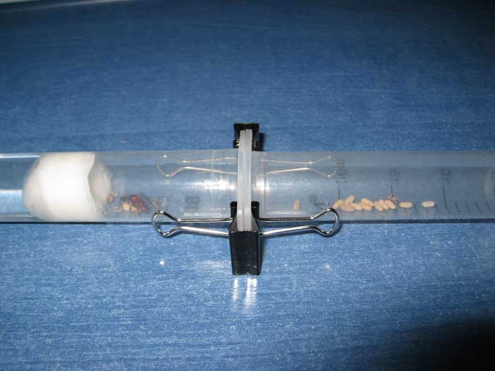 Пока что ведут себя культурно и складируют остатки около выхода или выносят наружу. На вату ничего не лепят. Хотя вата уже пожелтела, как и вода за ней. Я им положил свежий инкубатор, на этот раз из пробирки. Но переселяться они не торопятся. Существующие условия их видимо устраивают. Значит пока поработает как поилка со свежей водой.