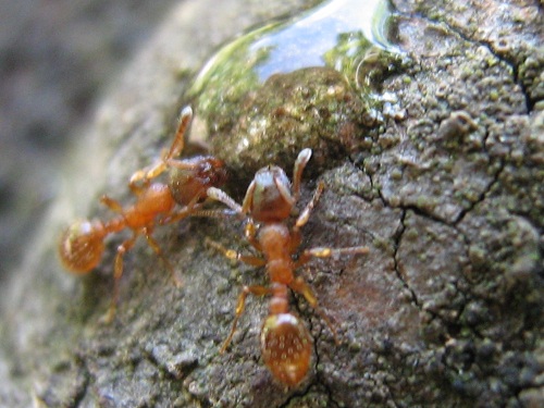 Также нашёл снова маток мирмецины. Ради эксперимента решил подсадить к этой (снова полигинной - 3 матки) семье рабочих. Одного нашёл под камнем, поместил к маткам - никакой реакции с обоих сторон. Рабочий отошёл в одну сторону, матки - в другую. "Какие-то они разные" - подумал я, сравнив маток и рабочего, но особого значения этому не придал, ведь маток мирмецины я никогда не видел (как позже оказалось - так и не увидел). В болотце, где живут головастики, поймал второго рабочего, который плавал в воде, однако был ещё жив. Поместил к маткам и его. Рабочий этот, недолго думая, подошёл к одной из маток, изучил её усиками, облизал и устроился рядом (вся суть примитивных видов - матку эту видит в первый раз, но уже принимает за собственную).
