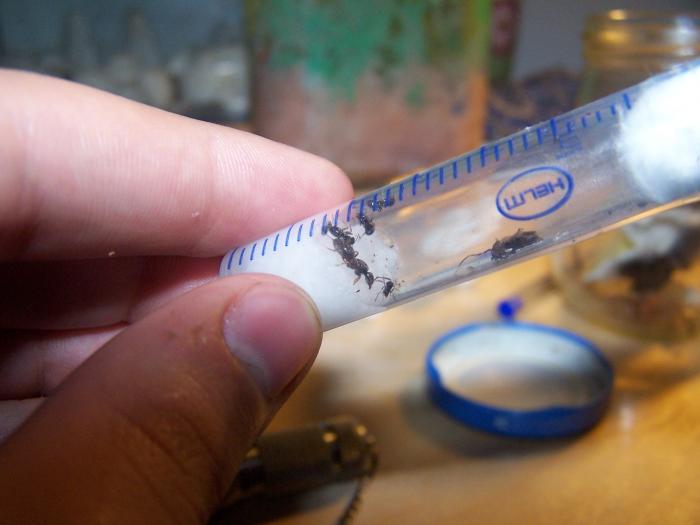Есть у меня 2 матки убрантуса с подкинутыми рабочими, и 3 матки мирмики sp, с яйцами, личинкой и рабочим.