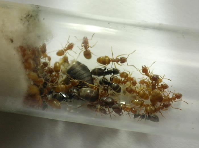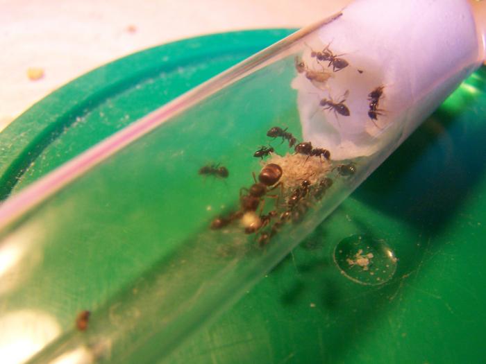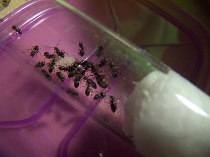 Вчера провёл некий эксперемент... Решил подсадить безматочных флавусов к матке умбрантуса... Отсадил нигеров... Но флавусы стали её грызть! Я решил их оставить, но потом заметил одного рабочего нигера которые запачкался в детском креме (им я промазываю края арены) и кинул как я думал на растерзание к флавусам... Но о чудо! Они его не трогают :))) Тут я подумал, а что если и матку... Так я и сделел ,намазал пальцы кремом, так что-бы там было чуть-чуть и взяв матку другой рукой помазал её им... Флавусы не реагируют! Но через некоторое время они стали проявлять к ней интерес! Я засунул её в трубку которая ведёт к пробирке, а на следующее утро флавусы окончательно её приняли!