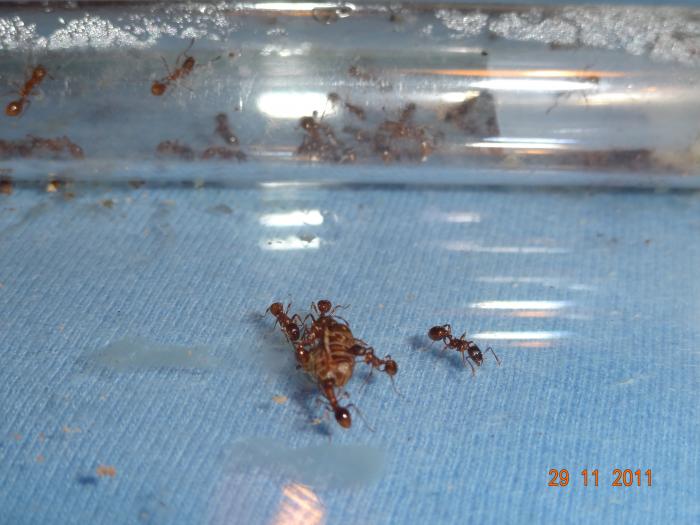 Вот ещё видео тут о том, как один муравей убивает другого ... Заодно в видео в самом начале видно их жилище целиком. Температура у них примерно 23-24 градуса.