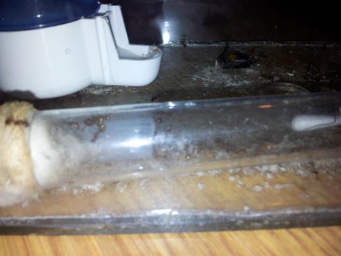 Посмотрел я фотографии и главным образом видео, и ужаснулся, у вас же помойка! Вам самому то интересно и нравится наблюдать за колонией живущей в таком тихом ужасе? Грязь, что-то навалено, жуткая пробирка, непонятное желто-грязное образование на входе из пробирке (это вас кто-то обманул вата такой не бывает), непонятная гигантская поилка ( сделанная из неизвестно какого пластика. Вы знаете из каких отходов ее смастерили китайцы?). И скажите на милость почему у вас пробирка до сих пор лежит на арене, сколько вам раз советовали ее оттуда убрать? ( вопрос риторический ответа не требует). Куски насекомых на арене, липкие пятна по всему полу... жуть, перечислять можно долго.