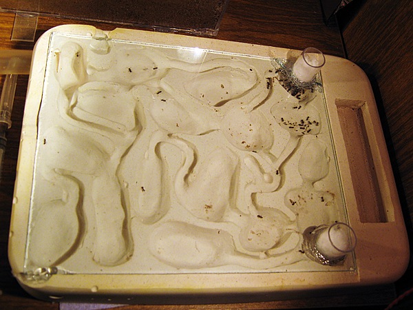 Формикарий горизонтальный, открытый гипс. Что примечательно, песок в формикарий таскают в очень малых количествах и только для окукливания личинок. Света не боятся абсолютно и стекла не пытаются залепить.