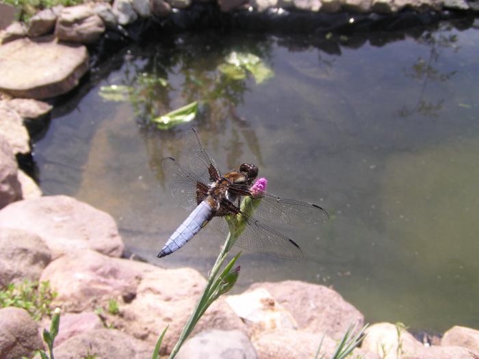 Еще добавил фото сада и его обитателей. Уж освоил каменную горку и по-видимому питался греющимися на камнях лягушками. Стрекоза патрулировала надводное пространство, изгоняя с территории других стрекоз. А пруд освоила компания золотых рыбок.
