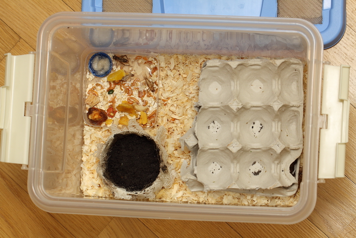 Поселил в пластиковый контейнер. Насыпал опилок. Положил картон от яиц в два этажа. Поставил кормушку.