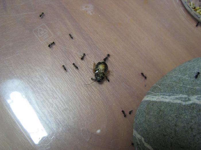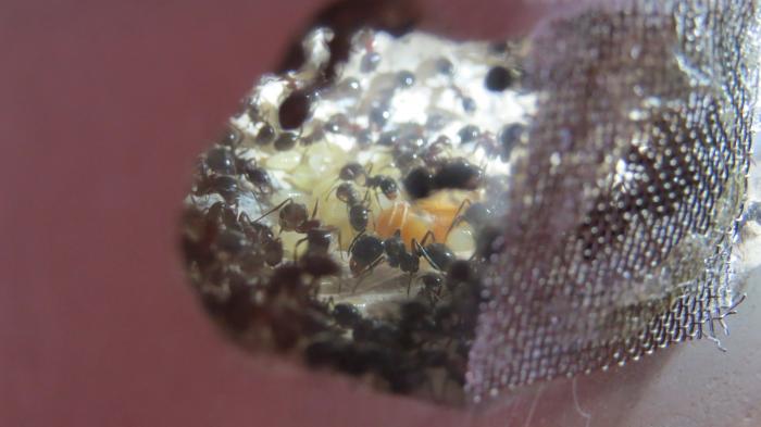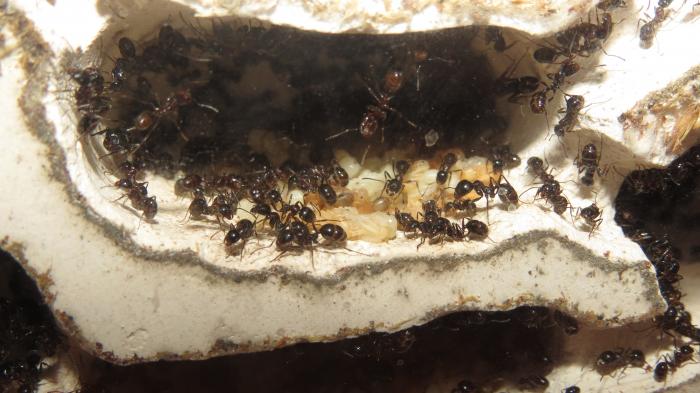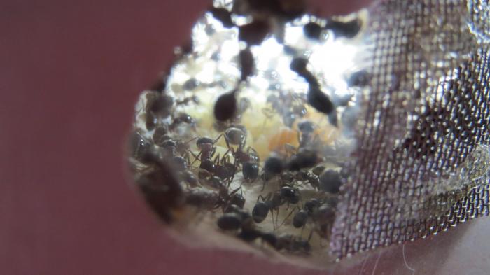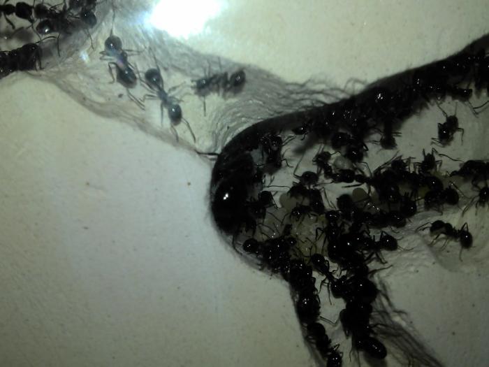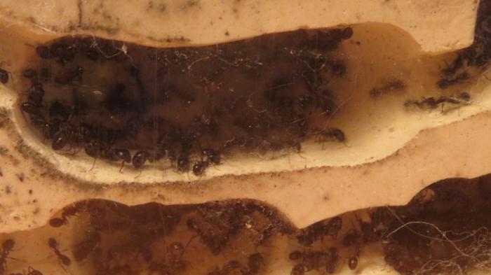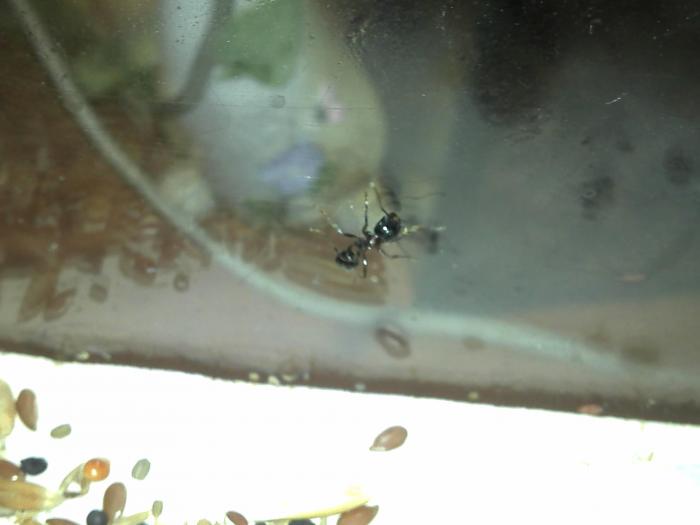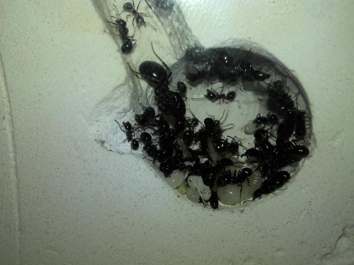 Крылатых перестали выводить, из тех маток, сделали рабочих, ходят бескрылые и в роли рабочих. 2 матки, основная сидит в приплоде. Развиваются хорошо. Едят много тараканов, на одной фотке запечатлил на арене матку - рабочего, которая чистится).