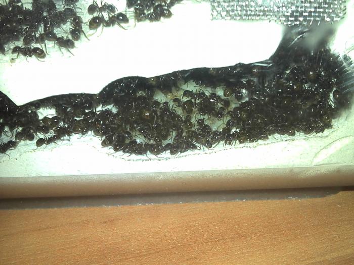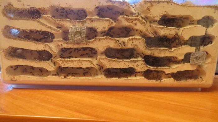Давно не писал о самой любой колонии, форм переселён, на арене порядка штук 100 рабочих, в камерах практически нету места. Не так давно мне сделал Борис ( Boris Mokrov ) форм для дентов, за что ему большое спасибо! Это фоторамка, вертикальный, размером 40Х50. В форме 14 камер, 4 отверстия с вентиляцией, 3 слева, 1 направо, увлажнение внизу. Форм я думаю будет вместительным. Фуражиры обследовали его, сейчас просто в нём ходят. Сейчас сушу старый форм ( не увлажняю ) и жду, пока они уйдут в новый. В колонии дела идут хорошо, едят много тараканов, развиваются нормально. Крылатых не было с июля 2013 года ( де и какой толк от них в форме?) ). Скоро переселяться...