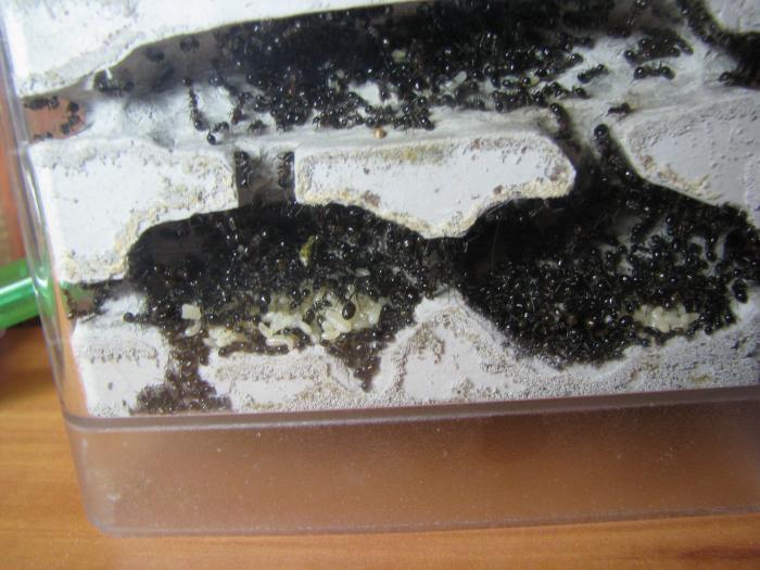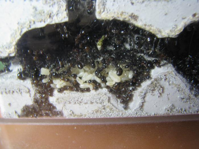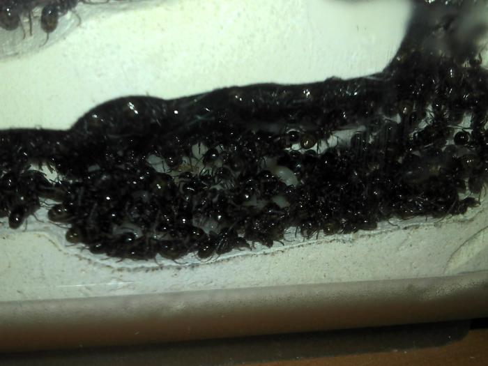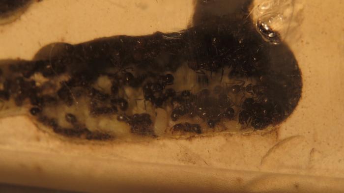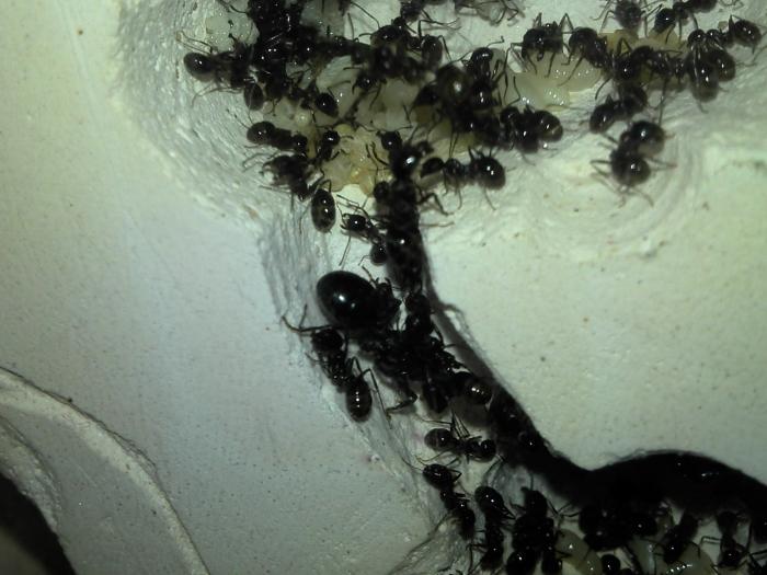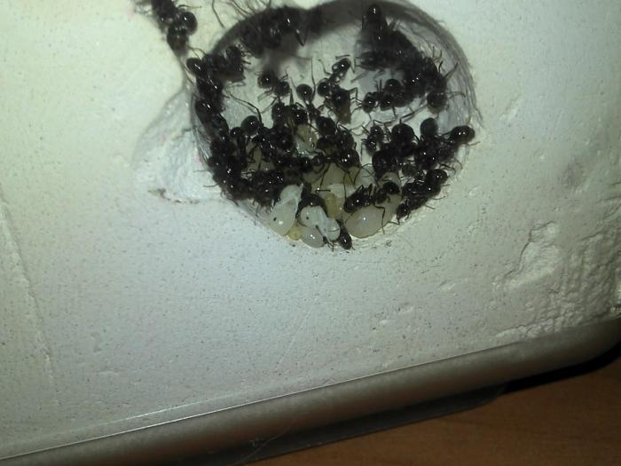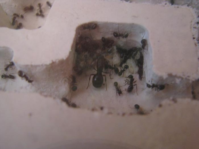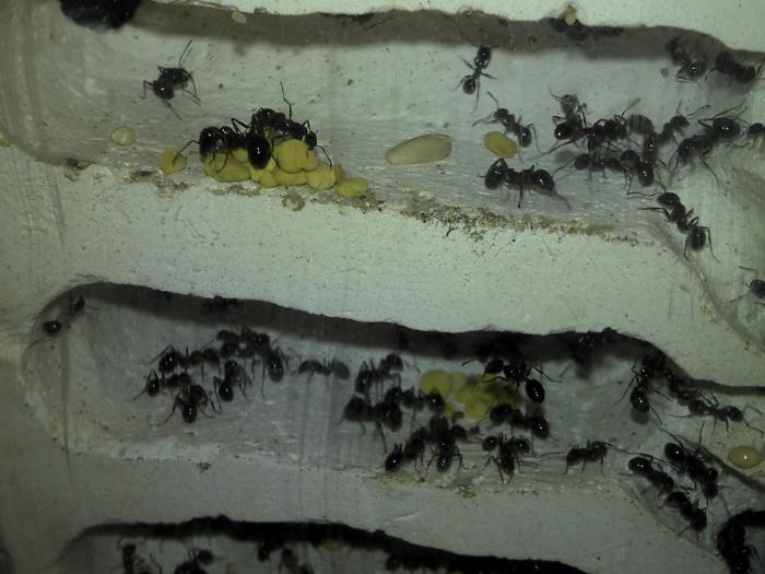 В старом форме они практически не плодились, здесь через 2 недели начали откладывать яйца ( причём пошли очень большие, интересно, кто будет, солдаты или самки? ) и понеслось. Матка активная, яйца кладёт, Из всех колоний они мне - как то роднее)). Наверно потому - что то первая колония, когда я снова вернулся в мирмекиперство))