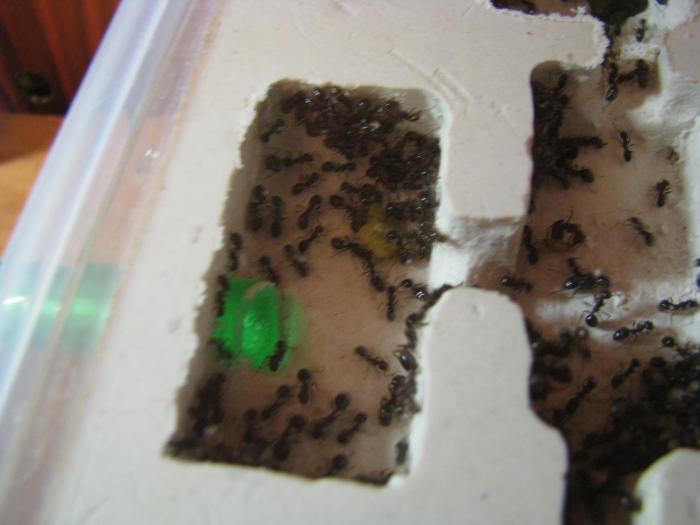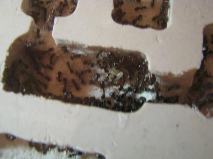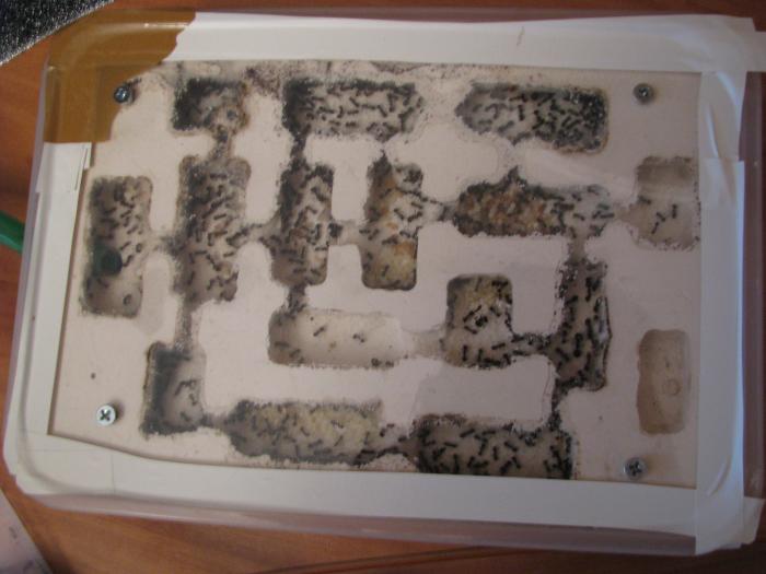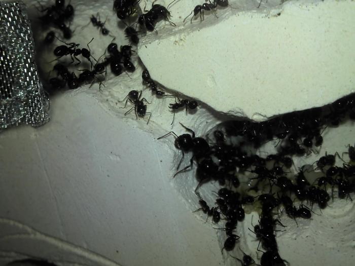 Порядка 800 ( если не 1000 ) рабочих, едят много. Думаю, этого форма хватит на 1 год. Стали появлятся крупные солдаты, на арене всегда порядка 100 рабочих, матку вижу ночами, поскольку ( видать плохо форм я высушил ) они прогрызли * большой круг * , там сделали по всей видимости пару камер, полно ходов, там матка как правило живёт. На фото можно увидеть изоленту, поскольку один раз они сбегали оттуда ( прогрызли и через щель бежали ). Пришлось заклеивать, попытку побега не повторяются. Расплоду в данный момент 3 камеры, много пакетов. Вот только что дал им мраморника ( едят лучше мучняков ). Вот сделал только что фотки, на данный момент моя самая любимая из всех колоний!
