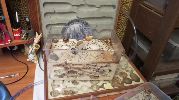 Заселил недавно дентов в 15 - ти камерный форм. Зерно так и не хранят, как их * братья * структоры. Количество рабочих примерно под 500. Сменил арену, т. к. приехали ко мне новый вид тараканов, пришлось отнять бокс, потом пошёл в хозяйственный магаз, и купил такую арену. Больше не пользуюсь вазелином, толку от него нет. Теперь сдерживаю от побегов губной помадой, помогает. Привыкают к новому дому.