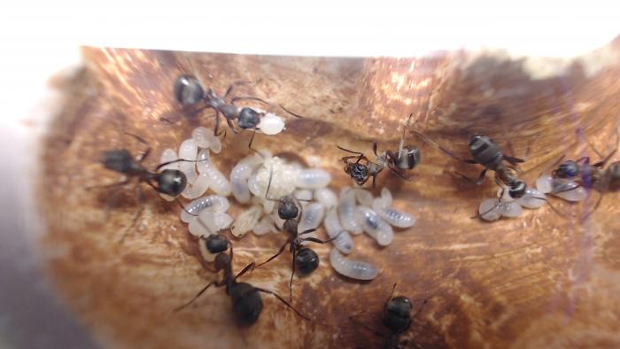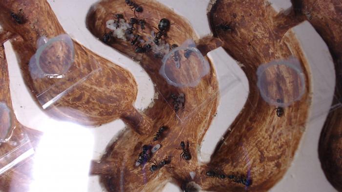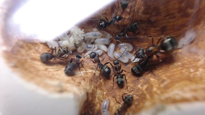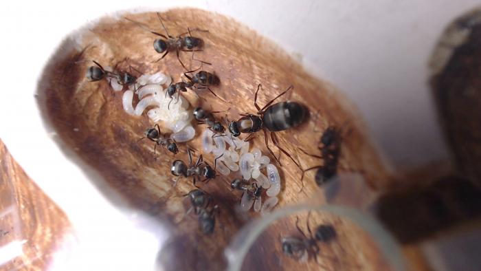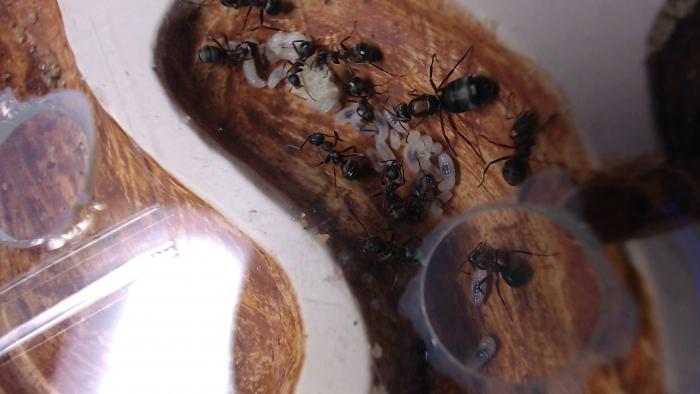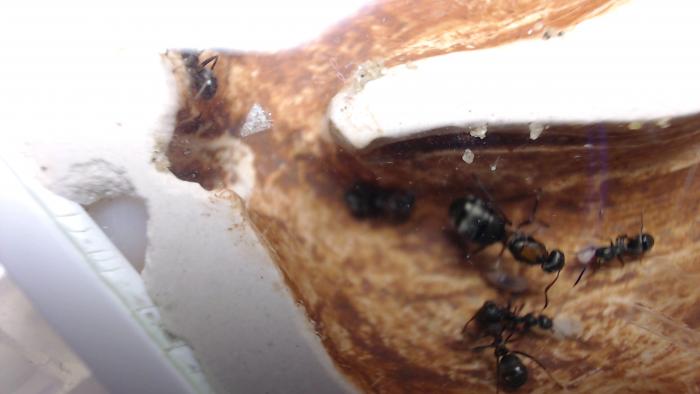 Камеры обработал скультурной глиной, которую мне прислал Юрий: развёл раствор как гуаш и мазал кисточкой. Мысли муравьёв не прочтёшь, но судя по тому как легко, если не сказать - стремительно - муравьи переселяются в формики с обработанными (оштукатуренными?) глиной камерами, им, муравьям очень нравится. В аптеках есть в продаже и синяя и зелёная глины.