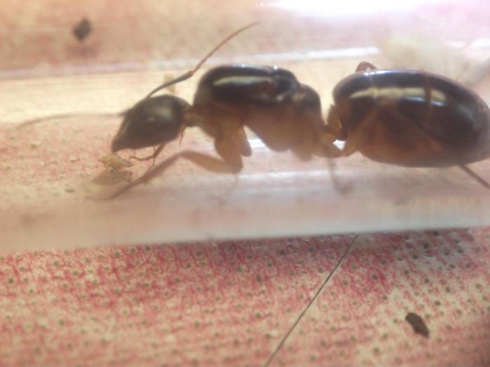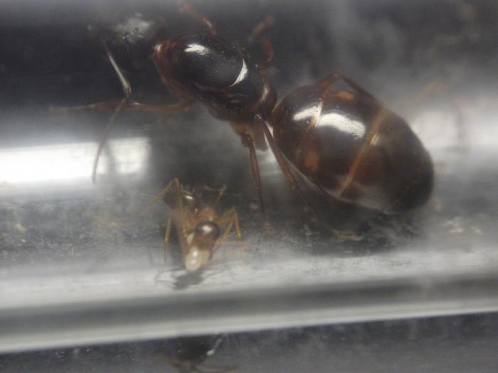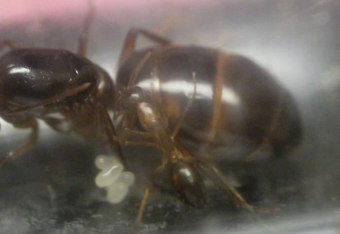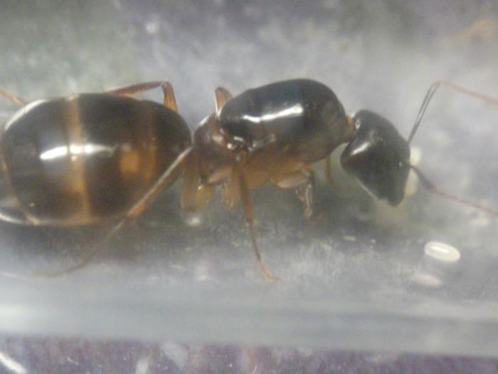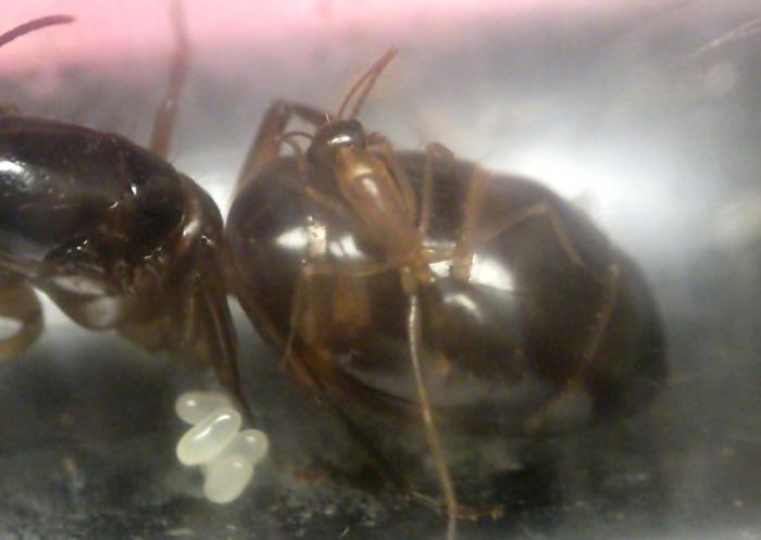 Матка Camponotus sp. "pilicornis" отдохнула с дороги, отъелась и приступила к кладке яиц. На данный момент отложила уже 5 штук. Единственный рабочий патрулировал и охранял подступы к кладке, т.е. в уходе за кладкой не замечен, матка все делает сама.