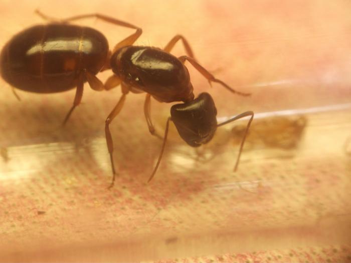 Не смотря на морозы состоялся переезд матки и рабочего кампонотуса от Sheddy из Санкт Петербурга ко мне в Рыбинск. Доехали без проблем. Сразу переселил их в другую пробирку-инкубатор и дал медового сиропу на ватке и пару мелких туркменских тараканчиков. Матка одного сразу схватила, подогнув брюшко побрызгала кислотой и принялась есть, затем к ней присоединился и малыш рабочий. Надеюсь что матка вскоре возобновит кладку. Добавляю небольшое видео. Вид пока не определил, жду подсказки знатоков.