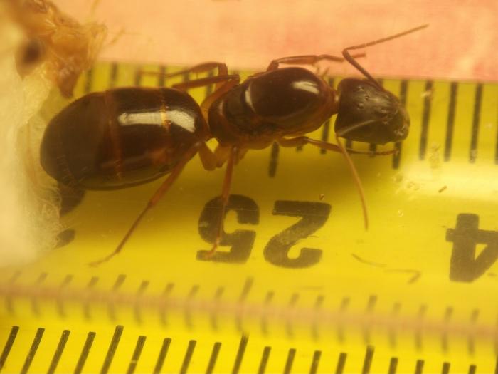 Добавляю фото матки на фоне линейки и единственного рабочего муравья. Матка поймана на Кипре осенью.