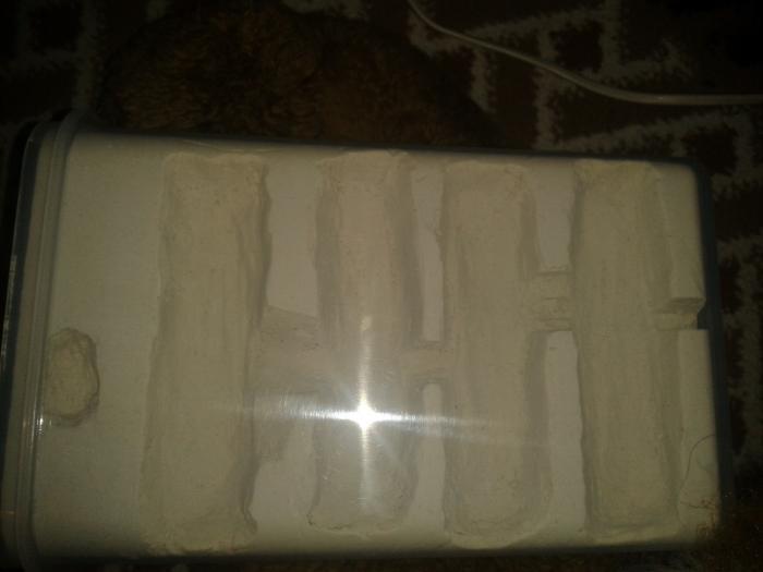Камеры лучше делать не тогда, когда он полностью застынет, а когда "схватится". Вскоре после заливки гипс нагревается и твердеет. Вот тут я его и достаю. Он уже не рассыпается и легко режется. Только аккуратнее надо. Можно сломать.