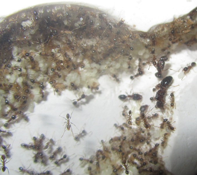 За качество фотографий извиняюсь - сложно сфотографировать через стекло таких маленьких мурашек. Формикарий фейдольки конечно изгрызли - такой уж у них характер, зато интересно наблюдать за строительством новых ходов, тем более все это навиду, т.к. в глубину не зарываются.