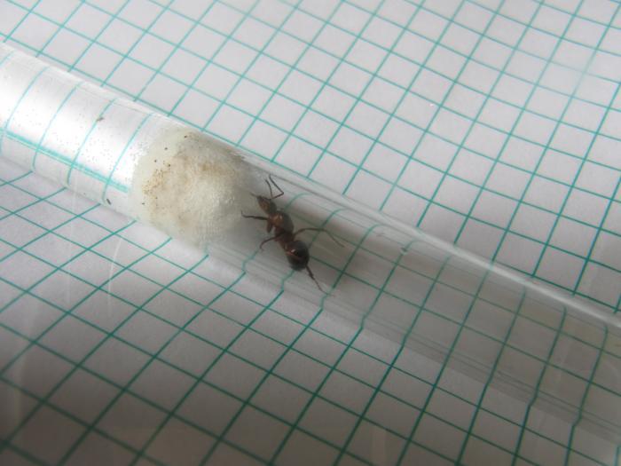 Добрый день! Посмотрите, пожалуйста, на мурашку, я не могу определить вид. Шустрая ужас! Носится как лазиус на жаре, грызет вату у входа, упирается лапами в стенки и толкается брюхом (впервые такое вижу). Слегка засомневался в ней, как в матке, но пропорции и крупный торакс. Помогите определить, а я вечером отпишу как словил.