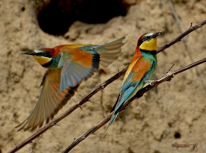 К слову о пчелоедках.Они же Пчелоедка или золотистая щурка (Merops apiaster).Красивая птичка,очень,такая как попугай,где нибудь в далекой Австралии.